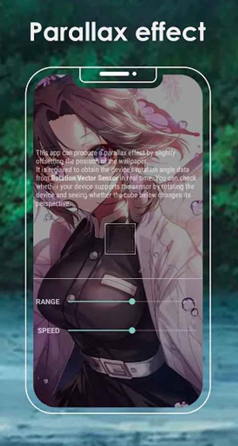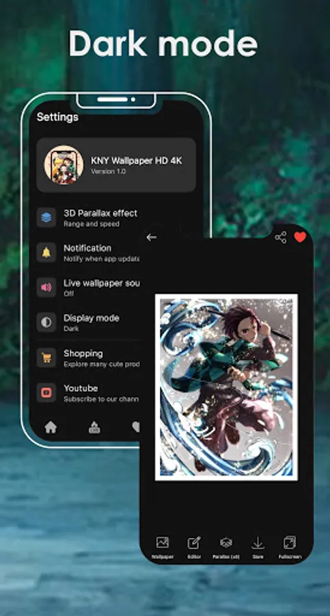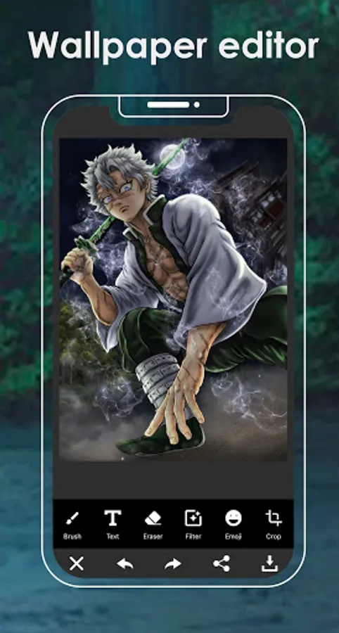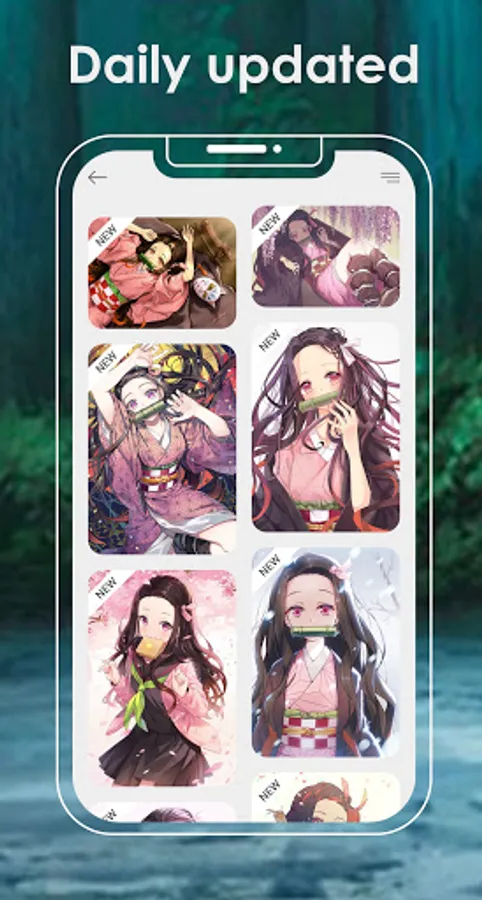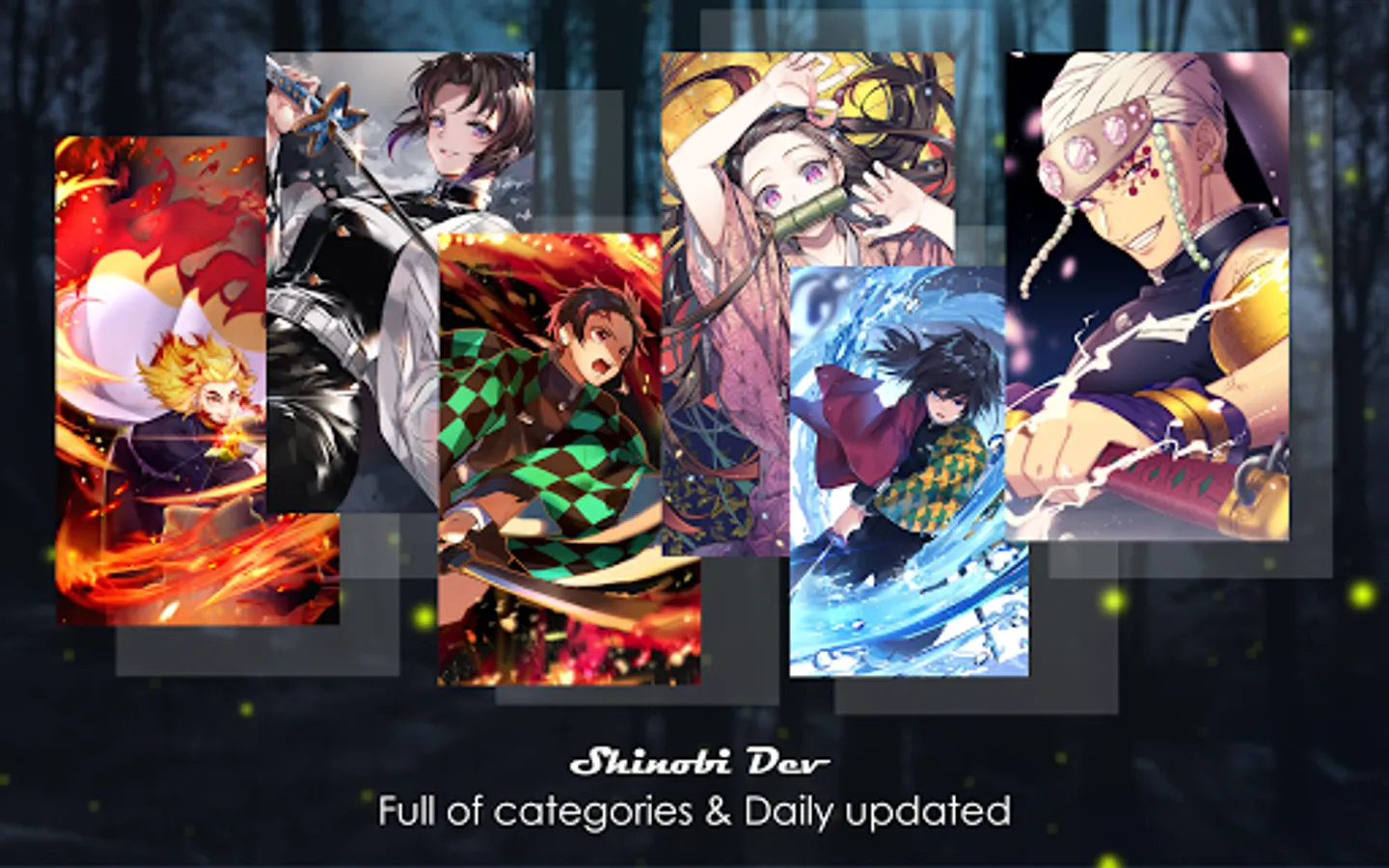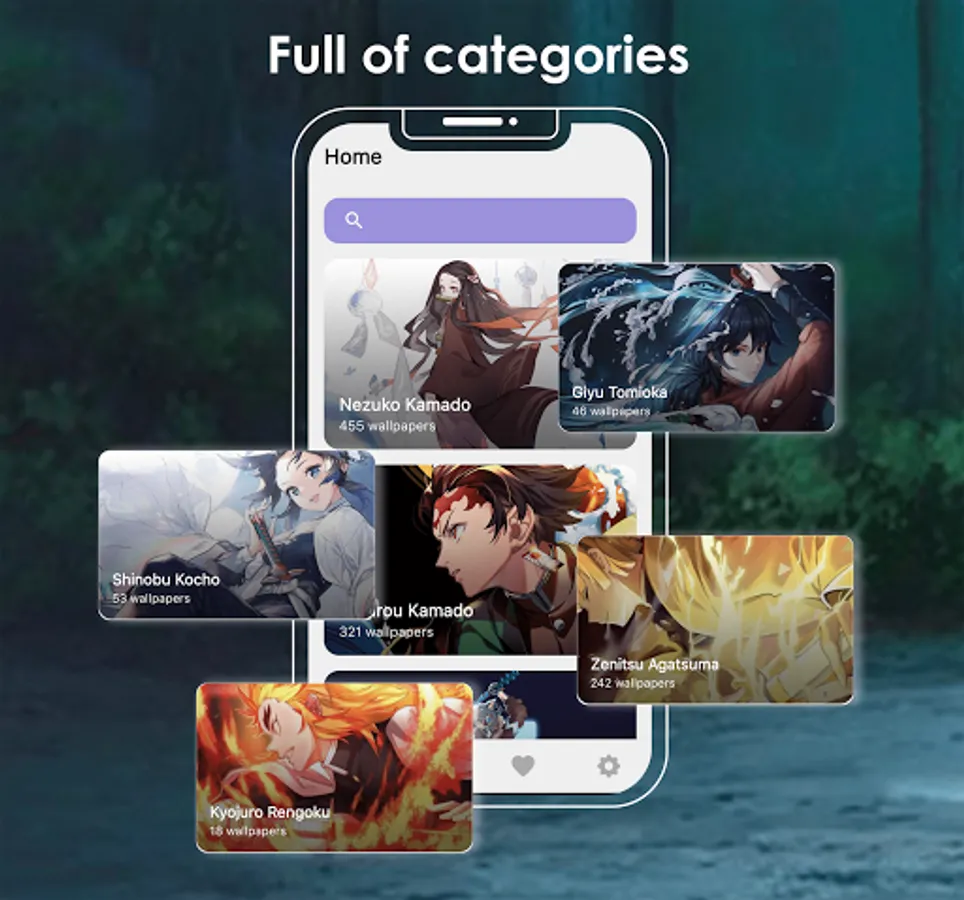 This app provides a huge collection of wallpapers: Tanjiro Kamado, Nezuko Kamado, Zenitsu Agatsuma, Inosuke Hashibira, Giyu Tomioka, Shinobu Kocho, Kyojuro Rengoku, Mitsuri Kanroji, Obanai Iguro, Sanemi Shinazugawa, Gyomei Himejima, Tengen Uzui, Muichiro Tokito, Kanao Tsuyuri, Demons, etc.