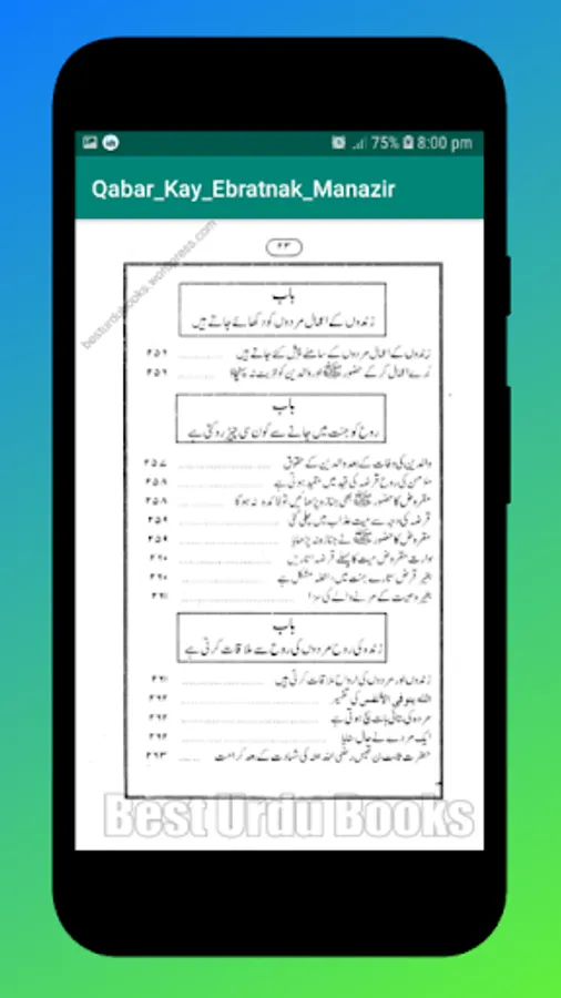 Qabar Kay Ebratnak Manazir is one of the Islamic book. The writter of this book is Molana imdad ul NOOR. In this book describe about life ofter the death.