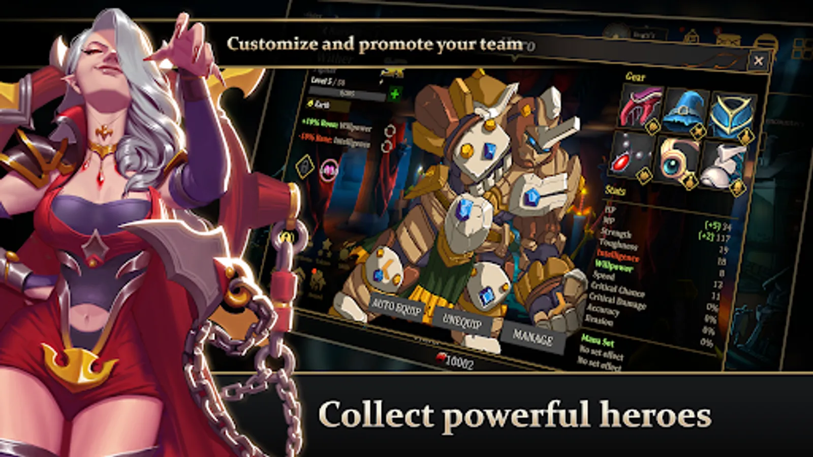 Using the rarest materials collected from your enemies, upgrade your town to unlock the ability to craft legendary gear, and equip your heroes to mold them into the perfect team for executing your battle plans.