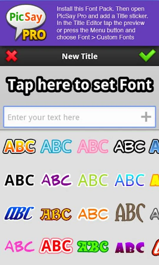 After installation, open PicSay Pro and in the Title Editor tap the Preview or press the Menu button and choose Font. See second screenshot above for instructions.