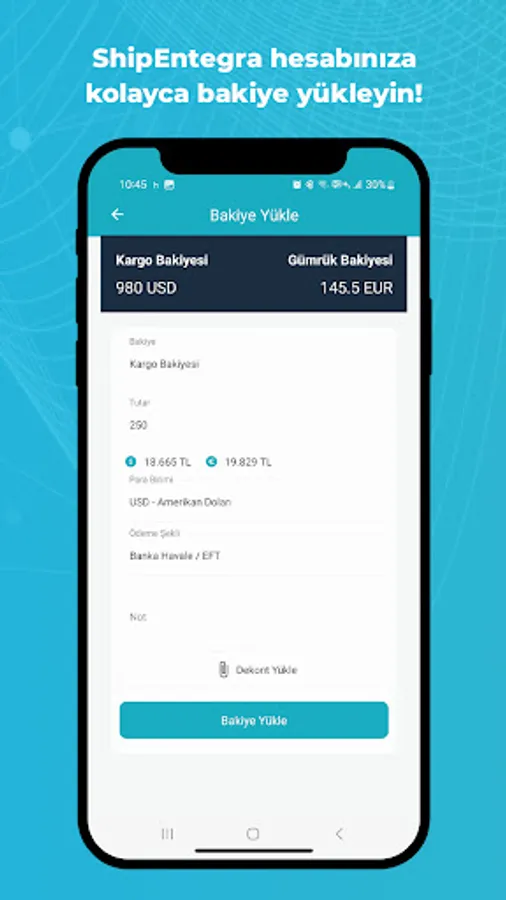 For your cargo balance payments (Dollars) and customs balance payments (Euros), you can easily top up your balance with Wire Transfer/EFT/Payoneer or Credit/Debit Card. You can check your Cargo and Customs balance history.
