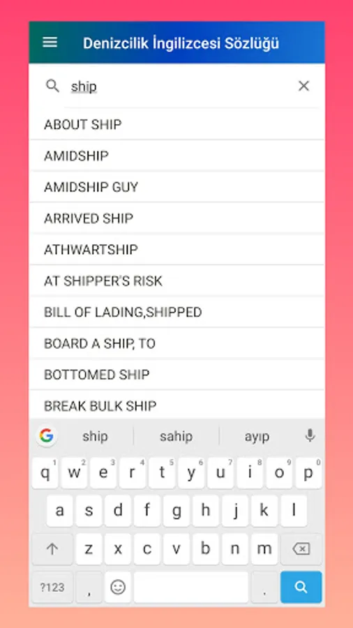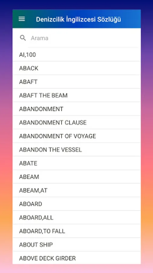 Maritime Dictionary - Denizci Terimleri - Denizcilik İngilizcesi ve türkçesi sözlüğü uygulamasının kullanımı çok kolaydır ve ayrıca A'dan Z'ye ingilizce ve türkçe Denizcilik Sözlüğü terimlerini içerir.