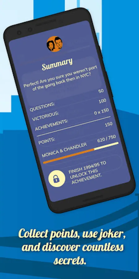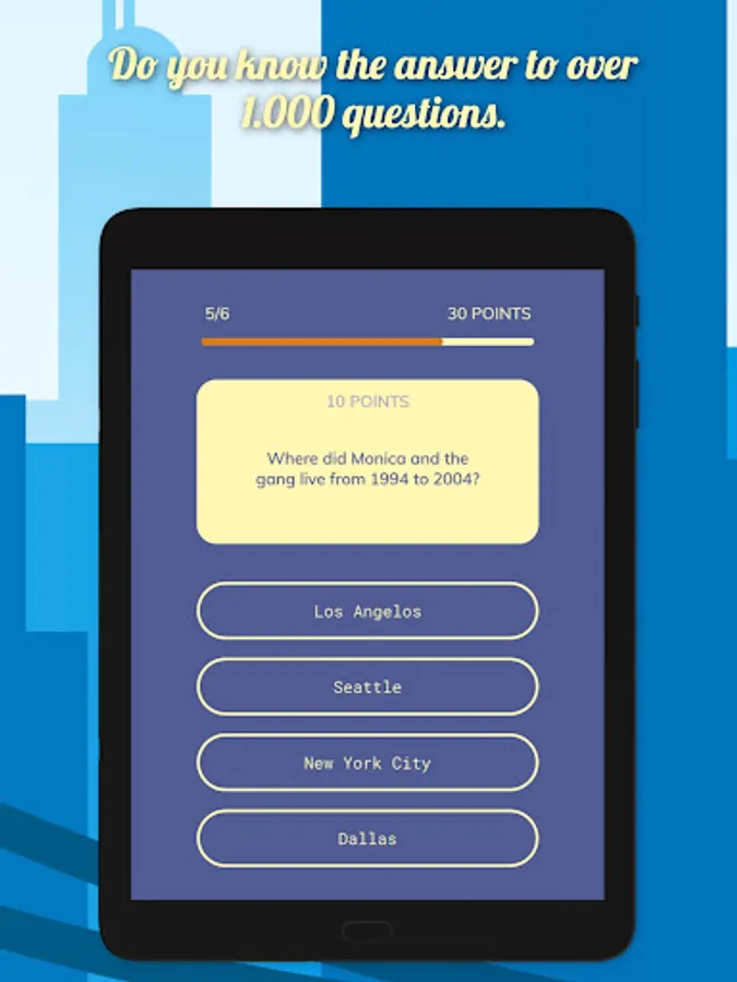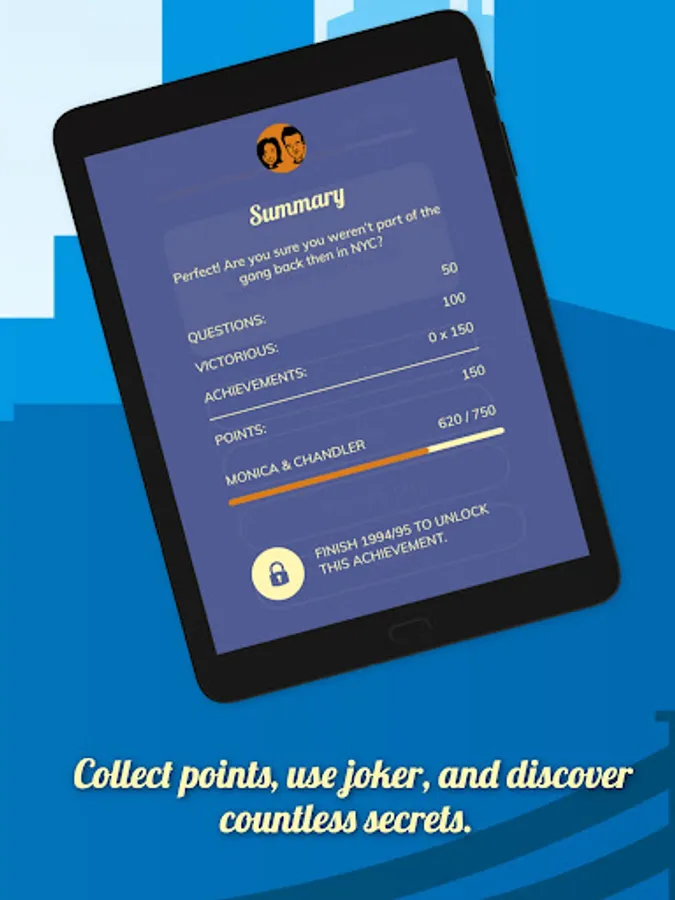 Answer over 1.000 questions in this amazing fan-made quiz game about the friends of NYC. Discover iconic moments and achievements throughout the game and play through all the years from 1994 to 2004.