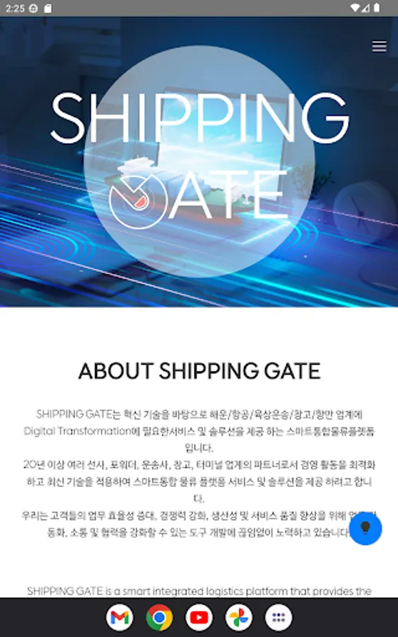 SHIPPING GATE is a smart integrated logistics platform that provides services and solutions necessary for digital transformation to the shipping/air/land transportation/warehouse/port industries based on innovative technology.
