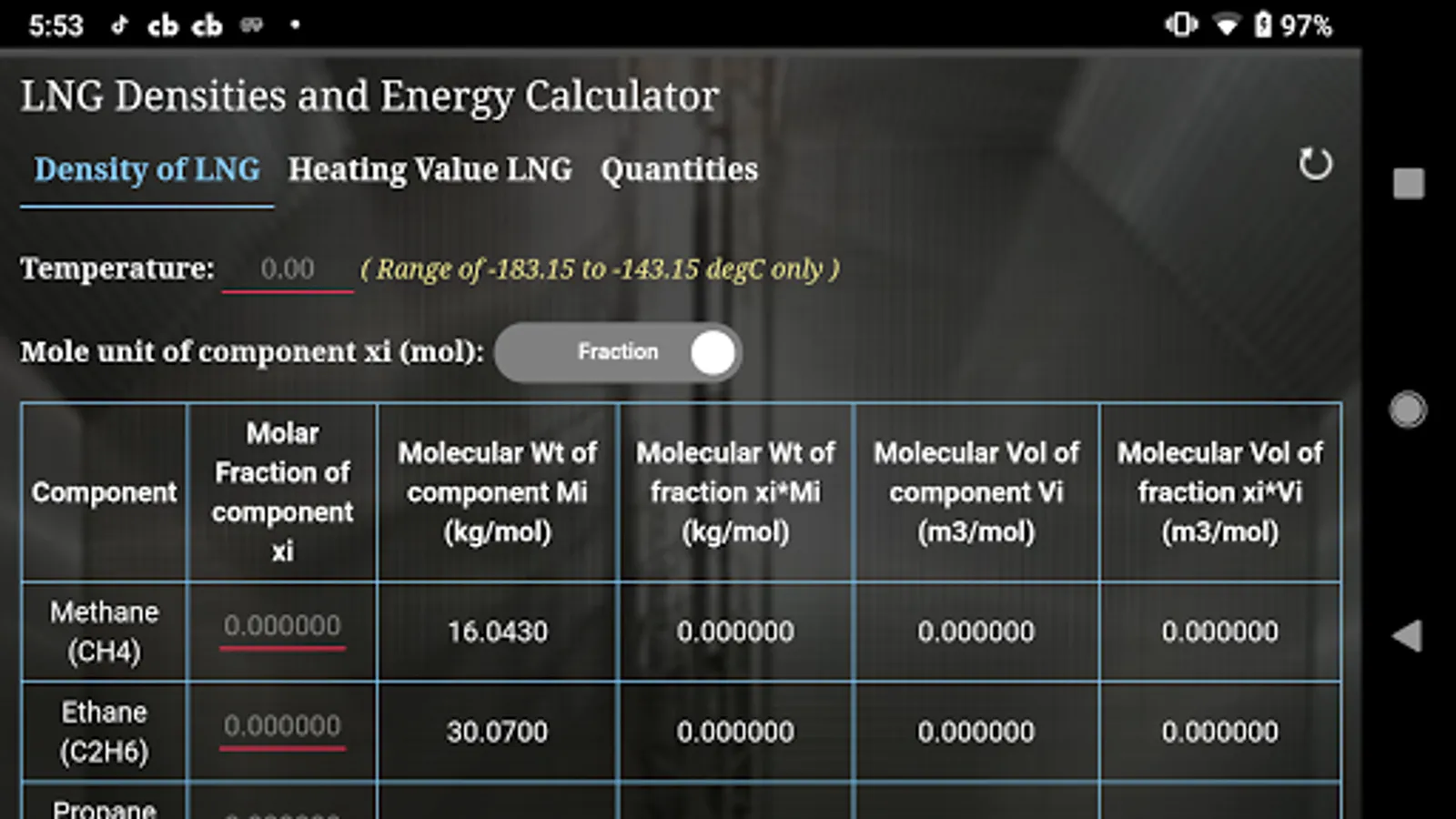 Using the App, in the first tab ‘Density of LNG’ enter the average liquid temperature of the cargo and the mole fractions or mole percentage of the liquid as determined by the Laboratory or as available from the quality certificate, the density will be calculated at that temperature, change the