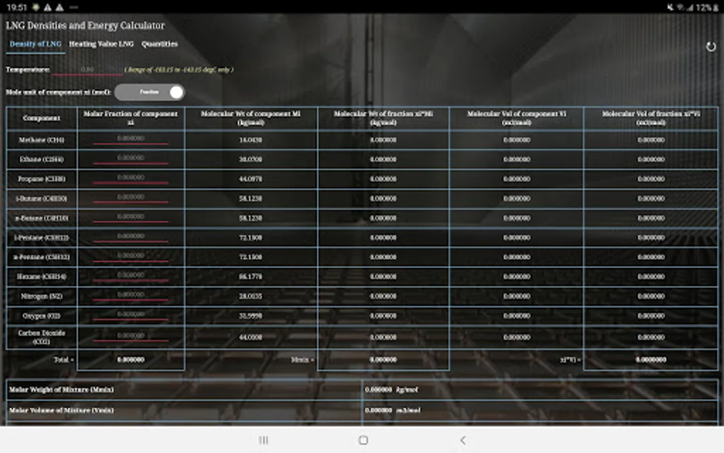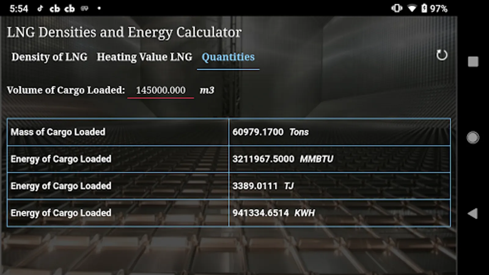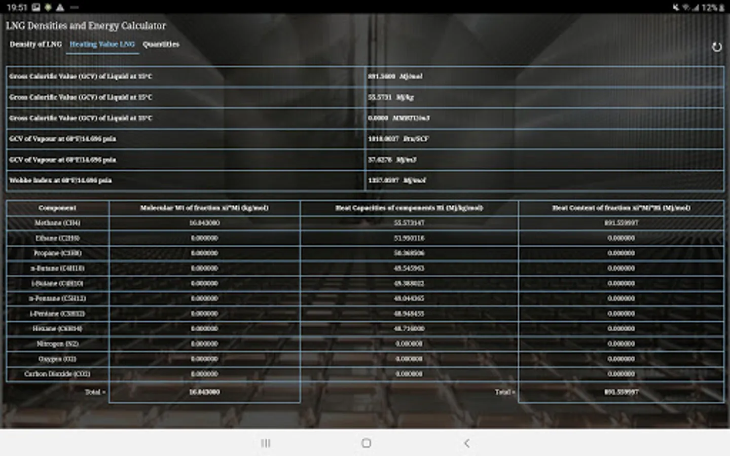 This App calculates the Density, Calorific value, Wobbe index and Energy content of LNG cargoes loaded on board an LNG Tanker.