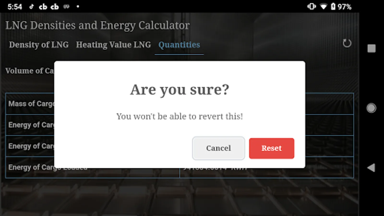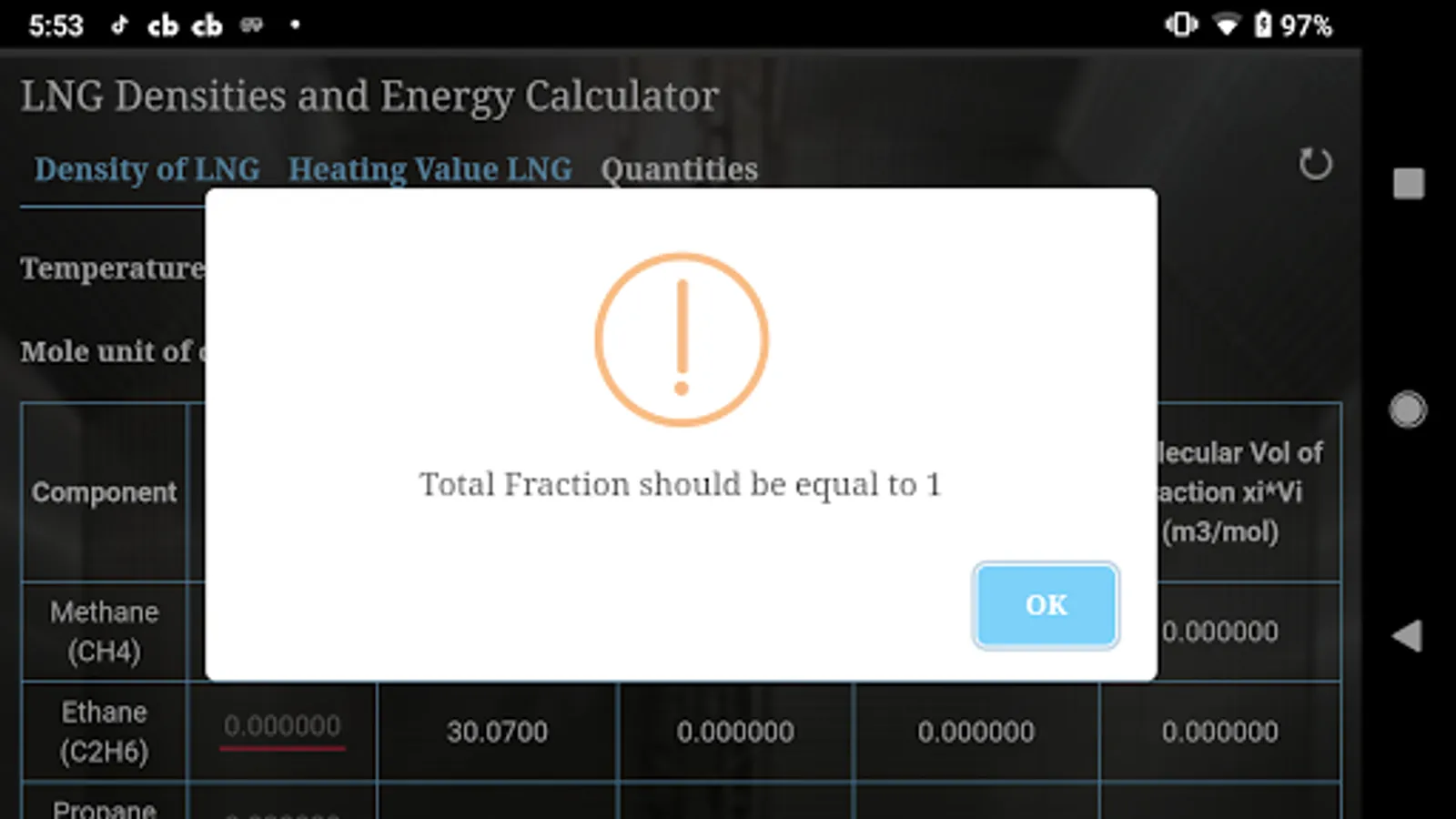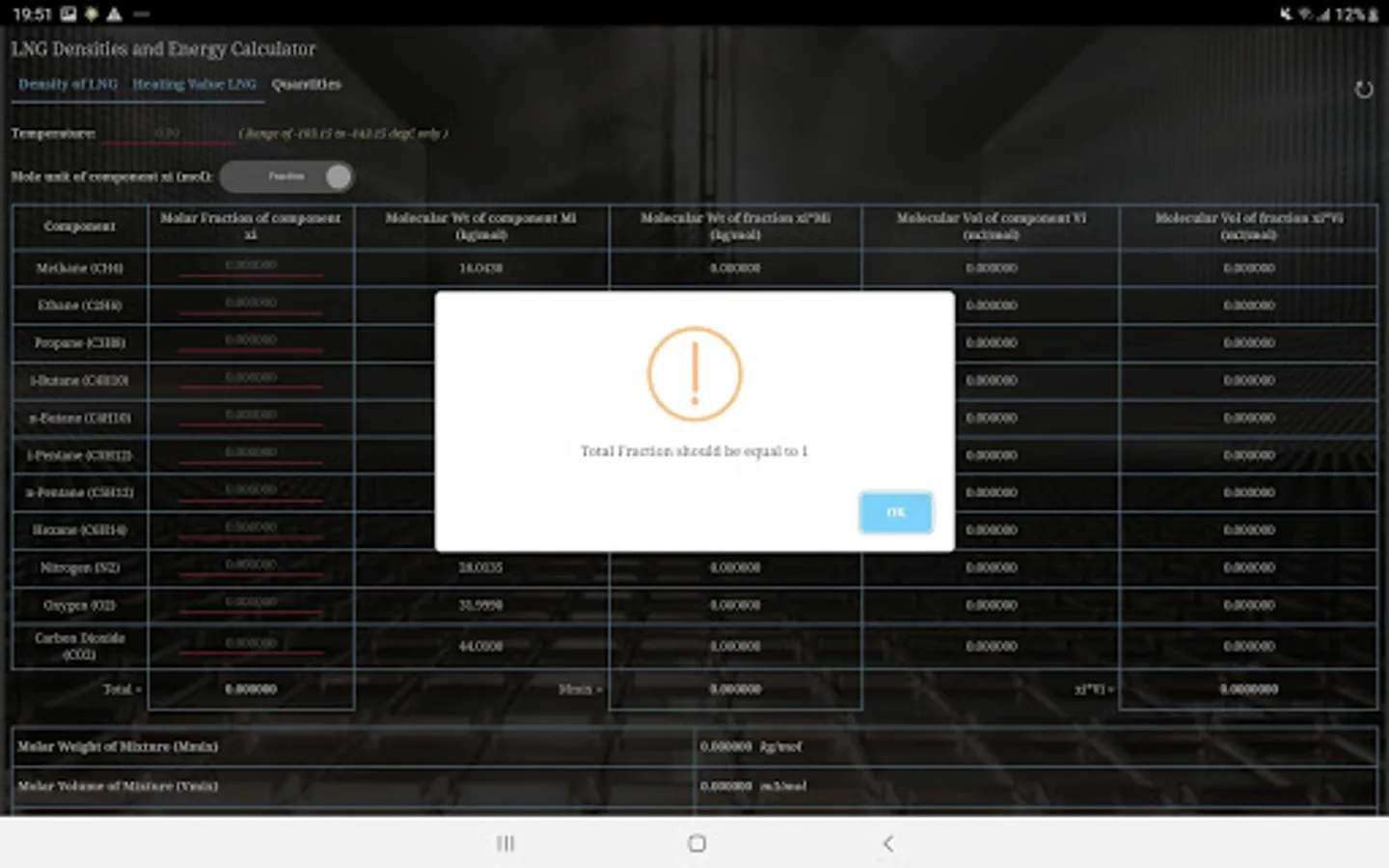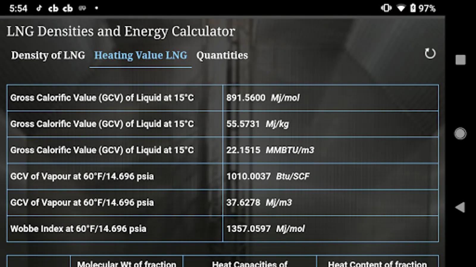 This App calculates the Density, Calorific value, Wobbe index and Energy content of LNG cargoes loaded on board an LNG Tanker.