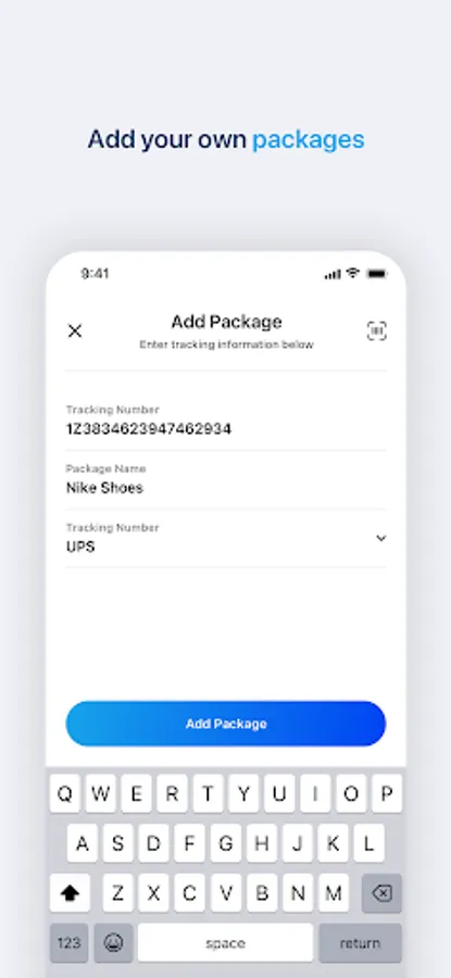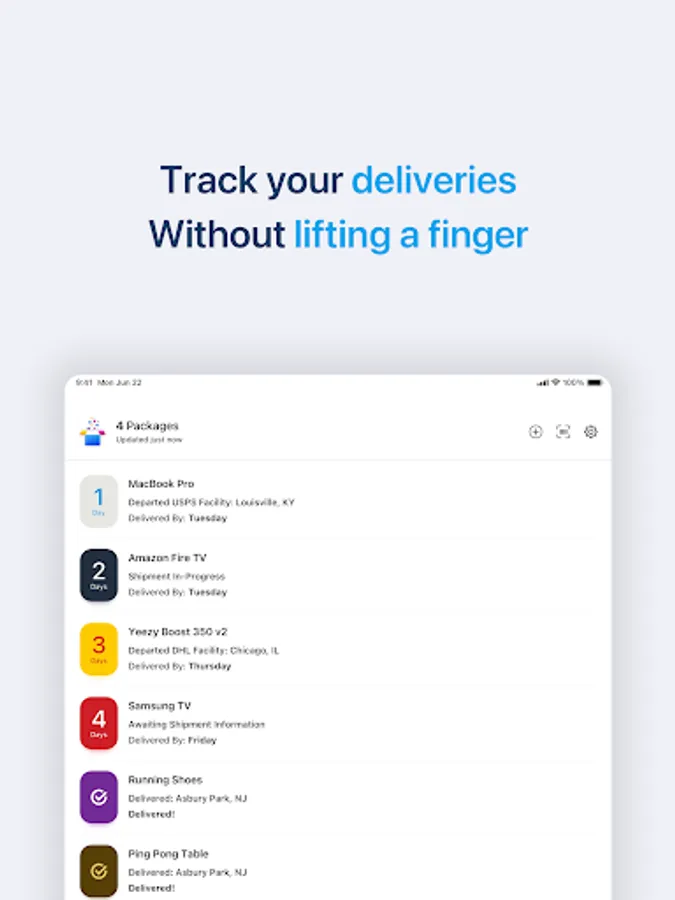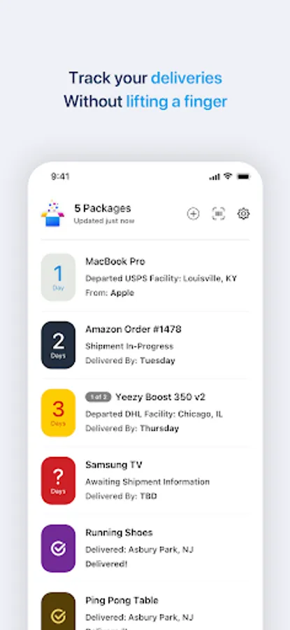 • Add your own tracking numbers to manually track orders not linked to your email.