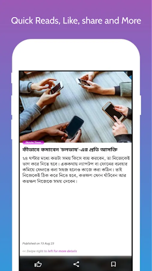 Our app offers a personalized reading experience, allowing you to like, share your favourite news and save for later reading.