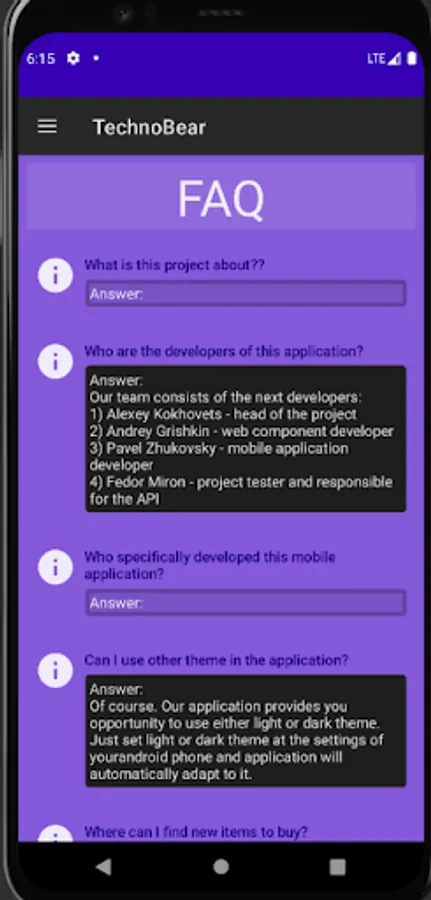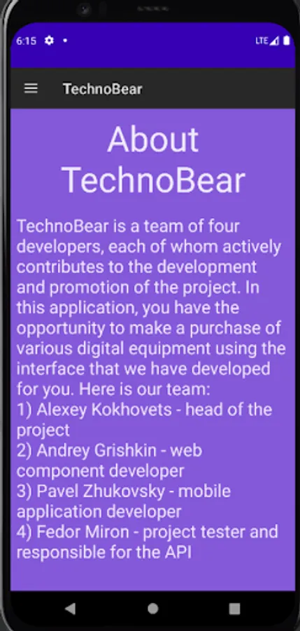 TechnoBear is a team of four developers, each of whom actively contributes to the development and promotion of the project. In this application, you have the opportunity to make a purchase of various digital equipment using the interface that we have developed for you. Our team: