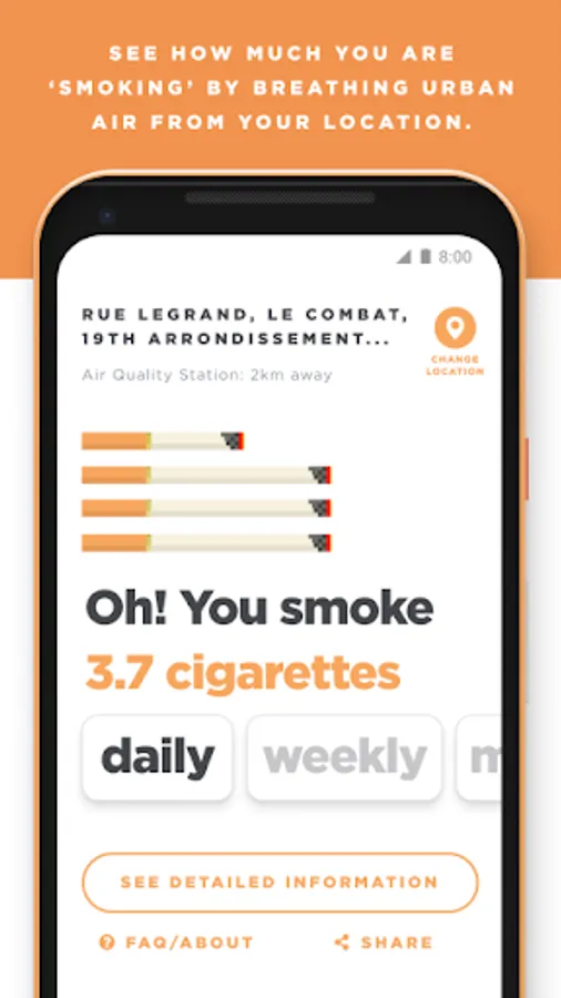 So we created this quick application for you to know how many cigarettes you are smoking in your city. You can share the number and help raise awareness about the risks of air pollution.