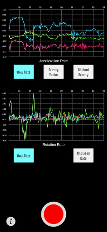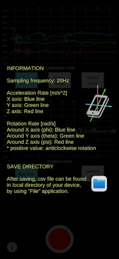 This App can measure acceleration and rotational velocity rate by using accelerometer and gyro sensor in your smartphone. It has recording start/stop button and measured time series data will be saved as csv file to local storage.