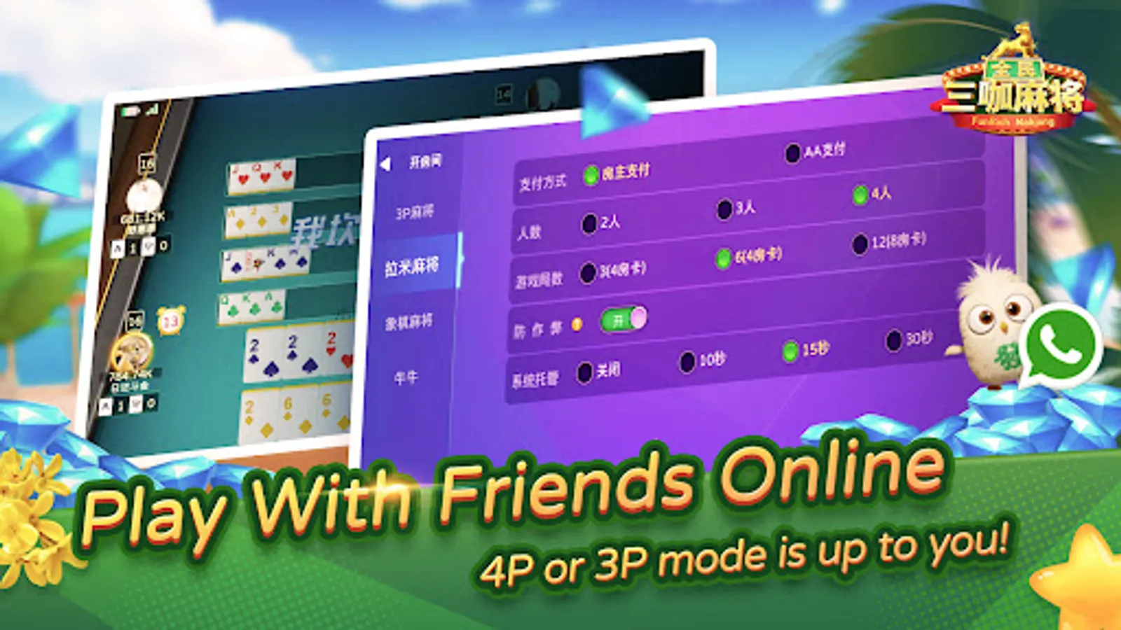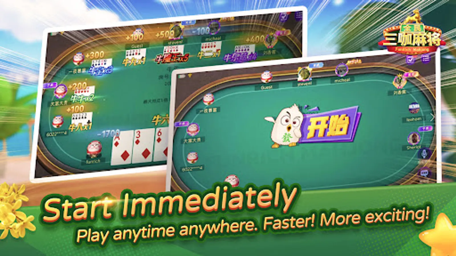 Ten thousand people are online at the same time waiting for you to join in the Club. There are even special gameplay such 2P Mahjong and 6 Fly Tile Mahjong that will give you exclusive and more exciting experience! You can easily not only enjoy the fun poker games, but also make many new friends with real-time voice chat and tons of interesting and lovely social emoji in the game!