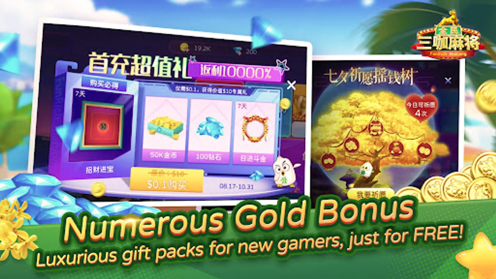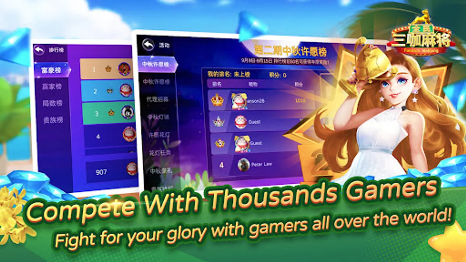 There are a lot of interesting game activities in game. Real-time Rich Ranking, Winner Ranking, Round Ranking are waiting for you to compete and show your mahjong and poker game level! There are also time-limited festival ranking which provides unique profile frame, title, mahjong desk theme and mahjong theme, gold coins as ranking rewards. All you need to do is just downloading this game and joining these activities. The rewards will make you famous in all server and show other players your exclusive style!