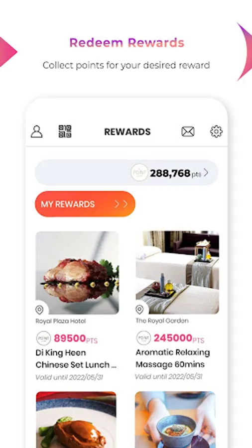 Go Royal mobile app also includes other convenient features such as checking points balance, redeeming rewards, receiving latest hotel promotions, enjoy hotel online services including room booking, table reservations, food takeaway / deliveries and e-Shop.