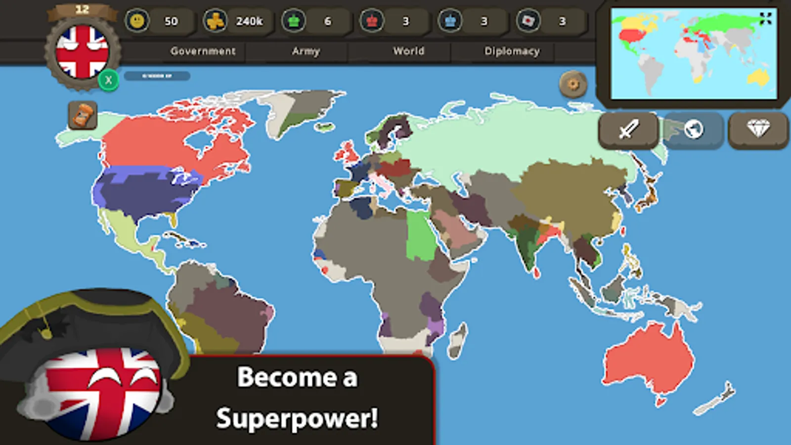 Countryballs at War is a Grand Strategy Game with turn mechanics and real-time combats involved. Your aim is to make your country a world superpower by building strong armies, controlling tax rates, increasing the happiness of your people, and upgrading your country.
