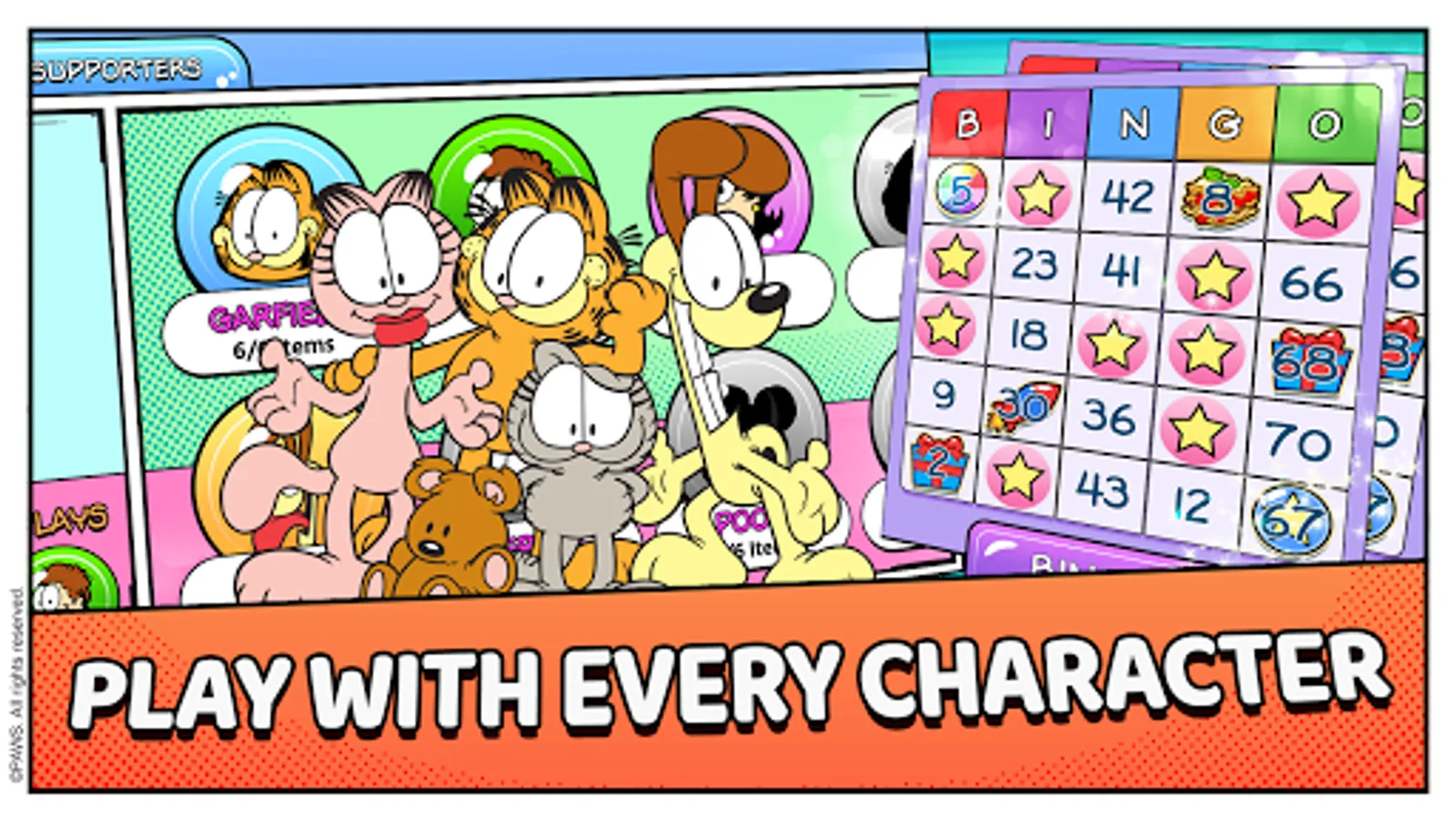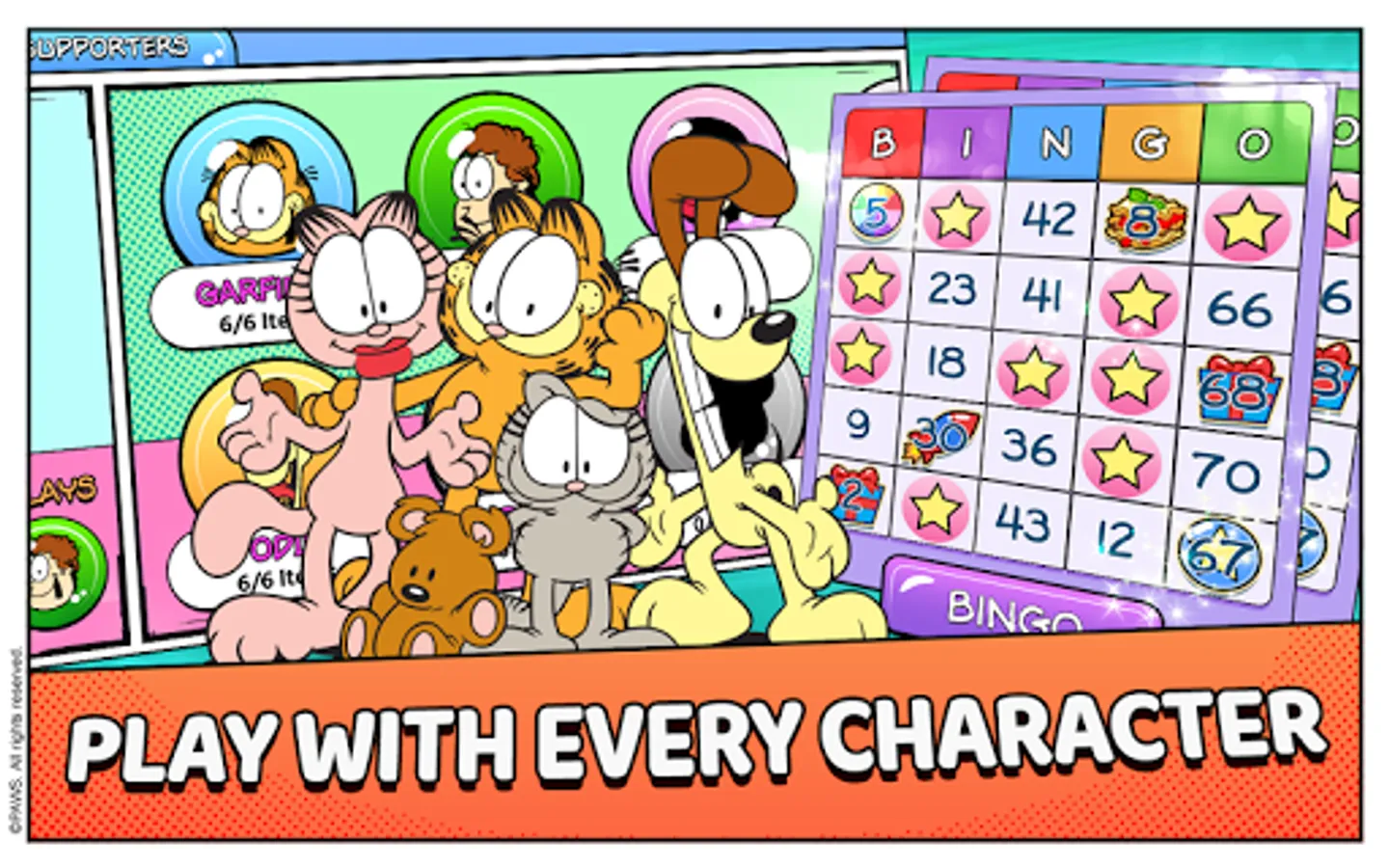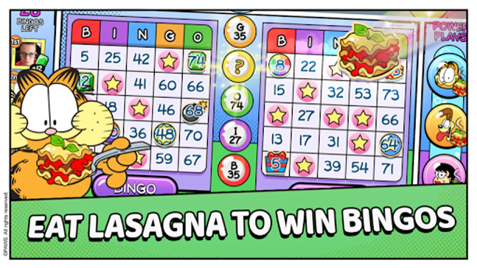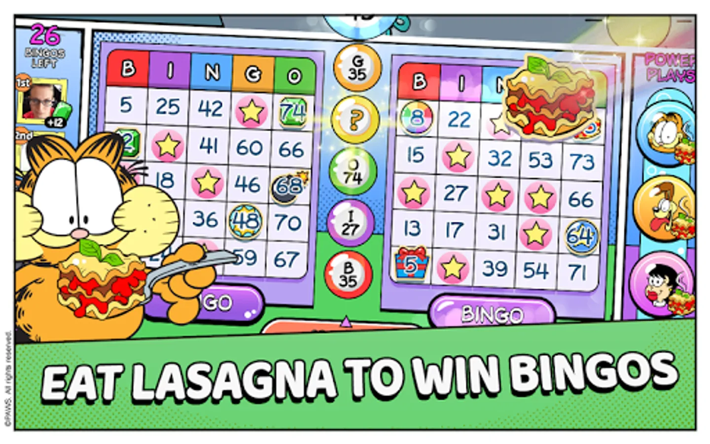 It's Garfield in a BINGO-PUZZLE adventure. Feast on lasagna to power your bingos. Play more than 20 different Garfield characters including Odie, Pooky, Nermal, and even Binky the Clown. Unlock them all and use their unique Power Plays to win more bingos.