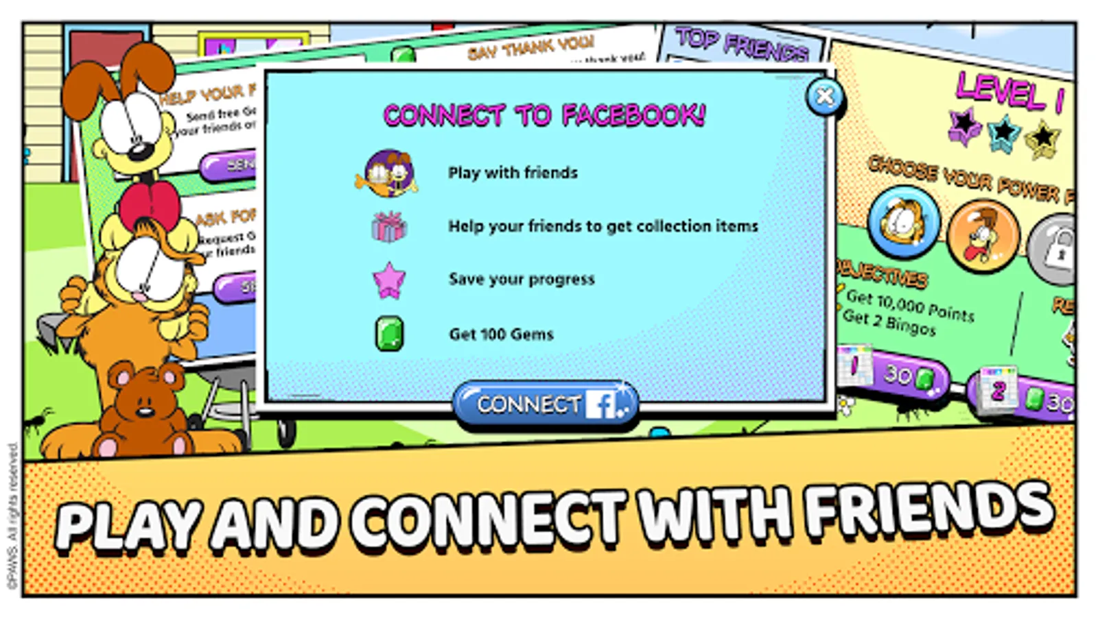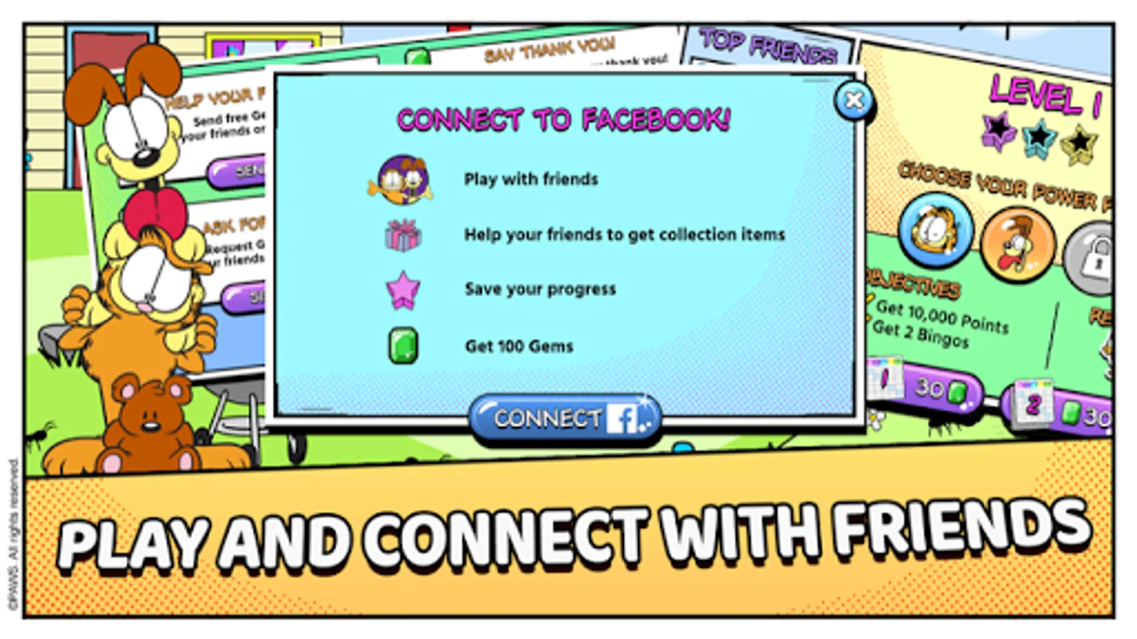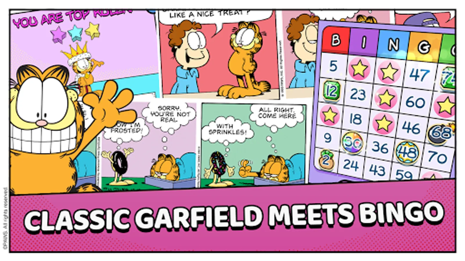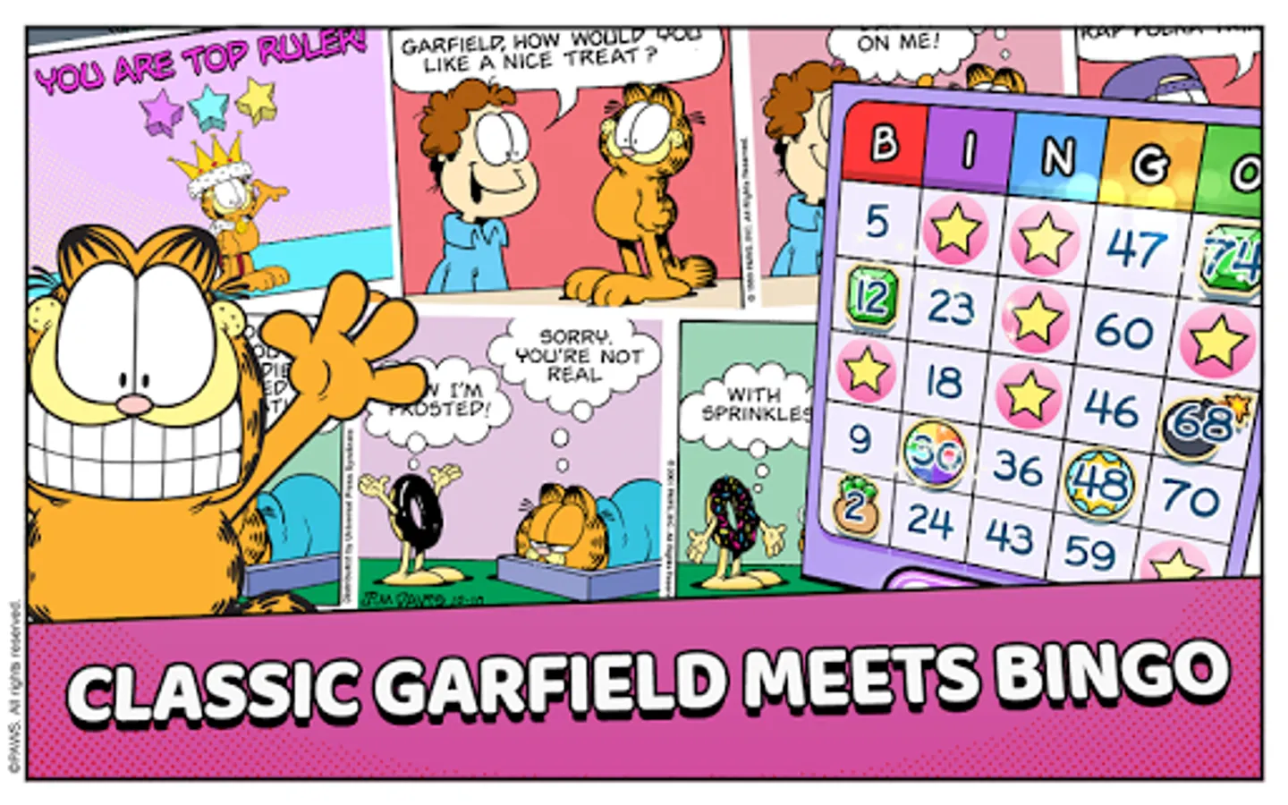 It's Garfield in a BINGO-PUZZLE adventure. Feast on lasagna to power your bingos. Play more than 20 different Garfield characters including Odie, Pooky, Nermal, and even Binky the Clown. Unlock them all and use their unique Power Plays to win more bingos.