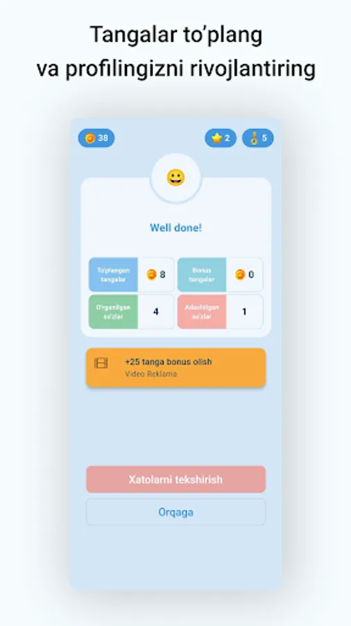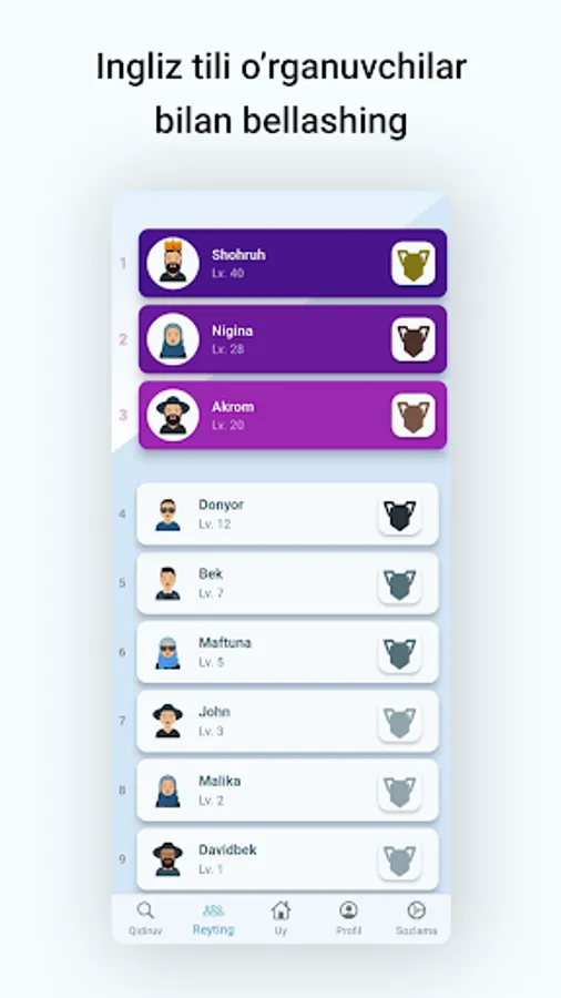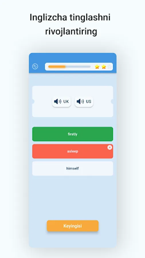 Eduza - Ingliz tili dasturi orqali siz 3300 dan ortiq inglizcha so'zlarni tarjimasi bilan, ularni talaffuzi, aytilishi va yozilishini oson va qiziqarli yo'lda, huddi mobil o'yin kabi, o'rganishingiz mumkin. Eduza - Ingliz tili 740 dan ortiq tallafuz, tinglash, yozish, va so'z manolarini o'rganish darslari mavjud. Siz shunchaki darslarni o'rganmaysiz, balki ingliz tilini o'yin kabi o'ynaysiz - tangalar yig'asiz, profilingizni rivojlantirib borasiz va eng qizig'i boshqa ingliz tili o'rganuvchilari bilan bilan musbaqalashasiz.