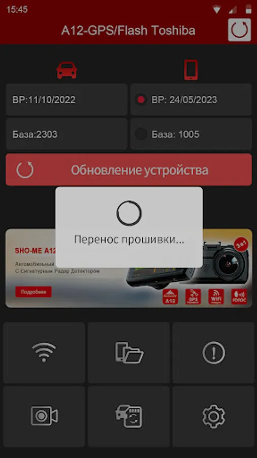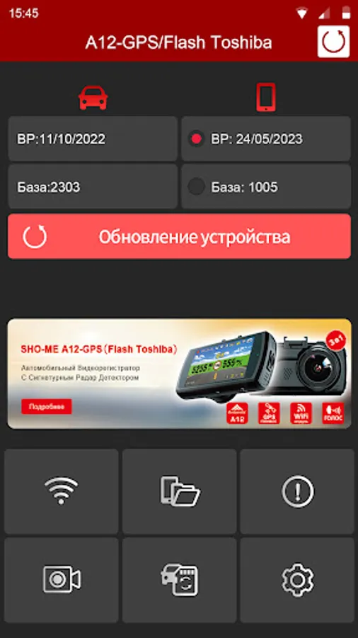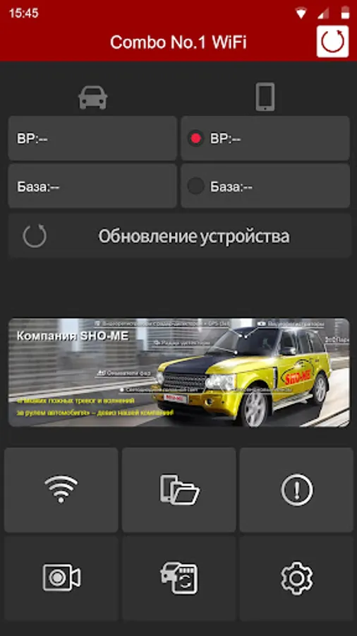 The application allows you to receive online video from SHO-ME A12 GPS / GLONASS WIFI, Combo 1 WiFi, Combo Raptor WiFi devices - play recorded video files and update the firmware and bases of stationary cameras