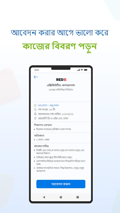 As the blue-collar workforce in Bangladesh is growing, the platform aims to provide job applicants with opportunities by helping them build a digital professional identity, a wide network, and professional training related to their skills, qualifications, and experiences to get a job. The app provides many job vacancies in Bangladesh, focusing on the following roles - call center agents, field associates, sales assistants, delivery men, office admins, brand promoters, riders, waiters, and related professions for more than a thousand renowned employers.