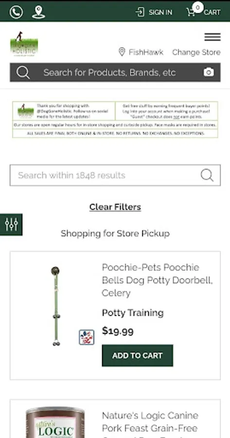 At DogGoneHolistic, we do more than sell top quality pet products. We're here to help you care for your dogs and cats the natural and holistic way! You won't find any foods or treats with corn, wheat, soy or by-product meal. Our pets deserve better. Using our app, pick the DogGoneHolistic store where you would like to pick up your order, then shop and pay online. When you receive the "order is ready" email from us (usually under 30 minutes), stop by to pick up your order. Curbside no-touch pickup available - just call us when you arrive at the store.