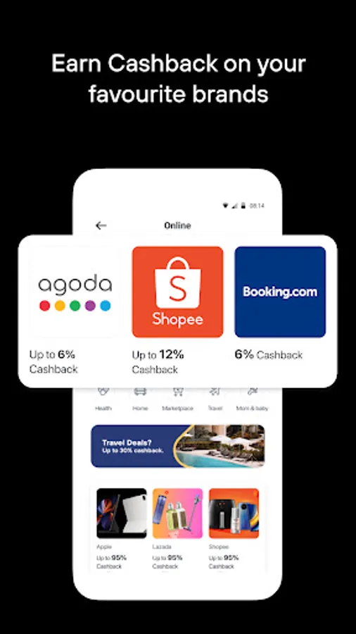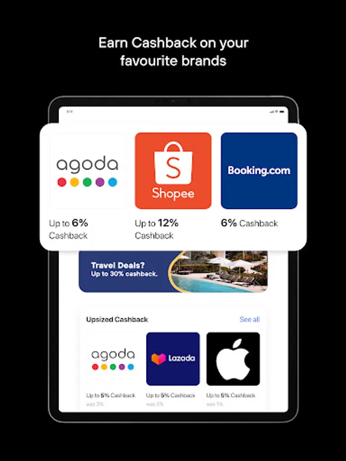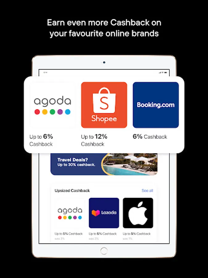 • TRAVEL: Choose from Booking.com, Agoda, Expedia, Klook and more to get Cashback on your flight, hotel bookings, and anything travel-related.