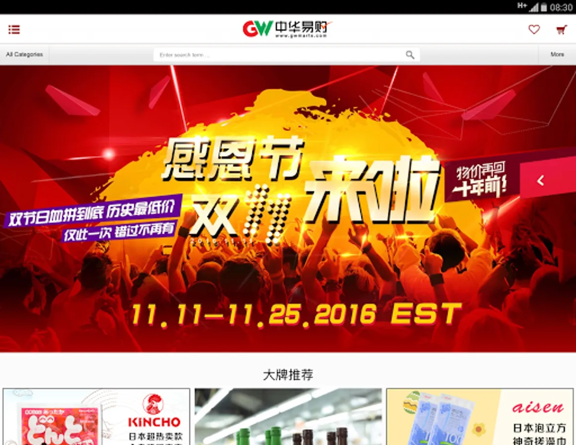 北美中华易购(www,gwmarts.com)2016年正式登场的大型网络购物超市。生活用品,零食小吃,美容化妆,手机数码等各种商品一应俱全。还有更多回馈消费者的超值活动。