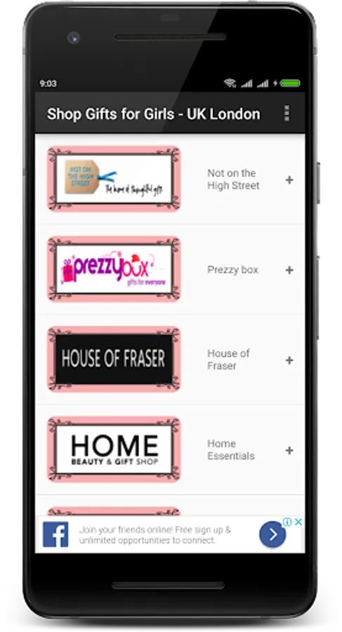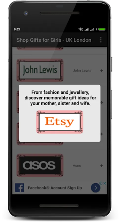 You can discover in our Application in the event that you are looking for presents or gifts for women. We have introduced an application where you can find any gifts you want from online stores. We have included some useful web links of top brands. This the web based application where you can look interesting gifts for her from top sites and brands like House of Fraser, Home Essentials, Not on the High Street, Prezzy Box, Getting Personal, Next, Find me a Gift, Debenhams, Etsy, Marks and Spencer, Asos, and John Lewis. In this APP seeking coolest gifts for your friends and family members would be a simple and incredible experience. Thousands of products could be searched here like jewelry sets, makeup products, clutches, shoes, dress and much more. Buy and shop gifts for girls in UK's largest online market for every gift giving occasions at lowest and cheapest prices. A large number of incredible gifts and present plans including exquisite blooms, huge brand collectables, fashioner scents and significantly more could be found for your mother, sister and wife.