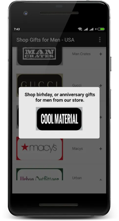 Looking for latest and unique gifts ideas for men? You can discover the latest and unique gifts collection for men from various online stores by downloading and installing this Application. This APP includes famous web portals and brands like Uncommon Goods, The Grommet, Amazon, Nordstorm, Personal Creations, Macys, Urban Outfitters, Brook Stone, The Body Shop, Man Crates, Gucci, and Cool Material from where you can buy coolest gifts for your Dad, Brother and Husband. Buy and shop gifts for men at cheapest and lowest prices from a wide range of selection with free shipping through USA. You can buy watches, boots, novelty socks, skin care, shaving sets, gadgets, tech, outdoor accessories and many more for all gifts giving occasions such as Birthday, Engagement Ceremony, and Anniversary.