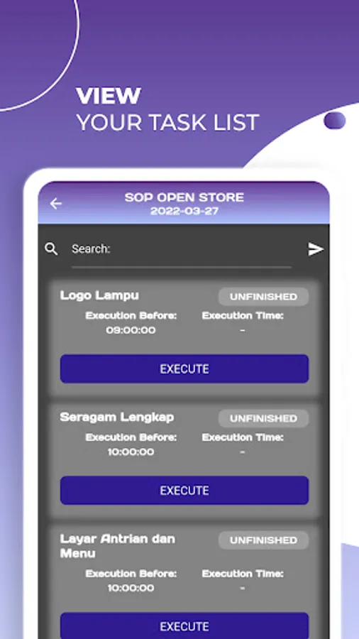 Fungsi monitoring lainnya yaitu dapat memonitor SOP yang sudah dibuat oleh Toko berjalan dengan baik. Pengguna Shoppatrol dapat melakukan pengecekan apakah SOP sudah dijalankan dengan tepat waktu dan benar. Melaporkan tugas SOP menggunakan Camera pada aplikasi Shoppatrol.