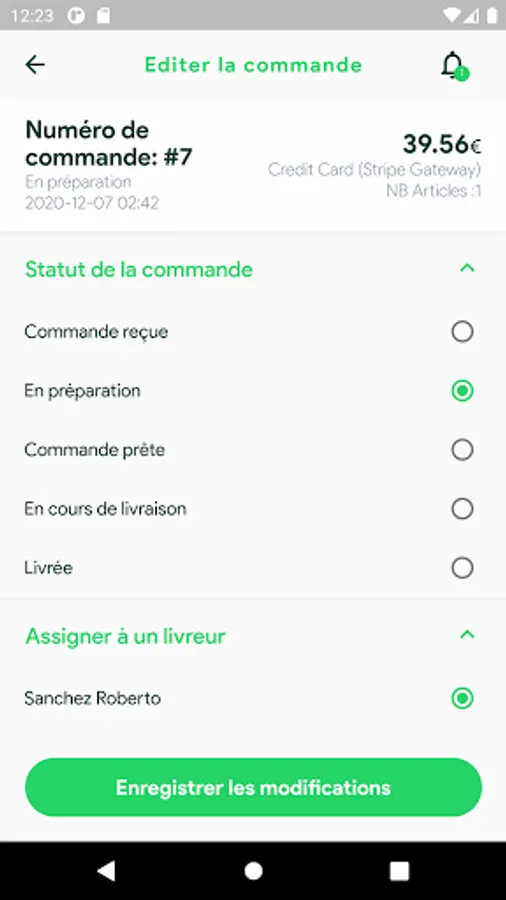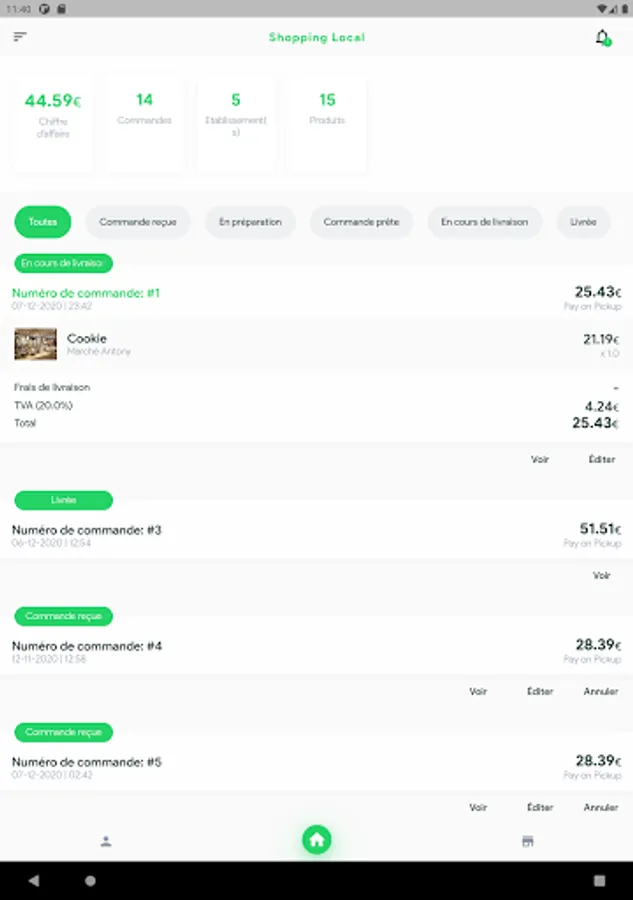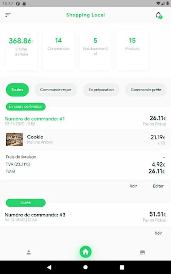 The Shopping Local Gestion application then allows you to receive orders made on your store. You can change the status of the order based on its processing. Once ready, the order can be delivered to a delivery person (who will receive a notification via the Shopping Local Delivery Delivery application) or made available to the customer if he has chosen Click & Collect.