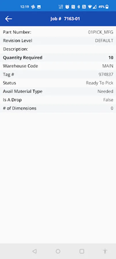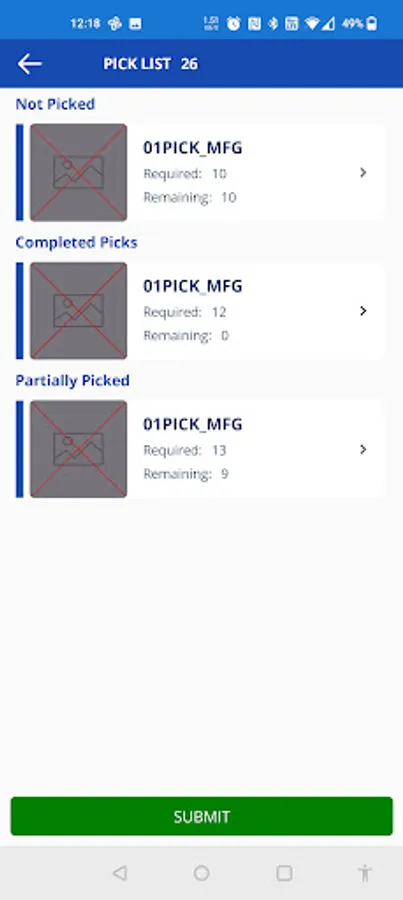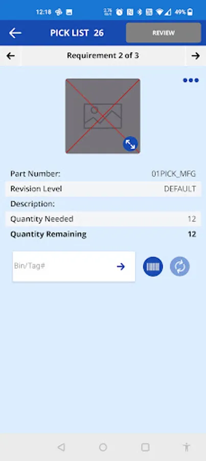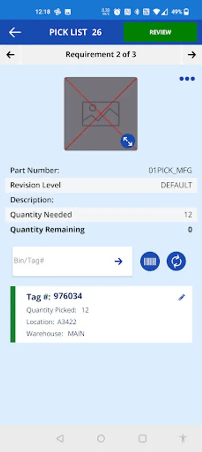 E2 MFG PickList allows users to view pick lists that are ready to pick and go through the process of picking the required items on the pick list. For each requirement, information is shown regarding which part is required and how many. Users can then scan Tag Numbers to actually pick the items. The user may choose to process or finish the pick list from there.