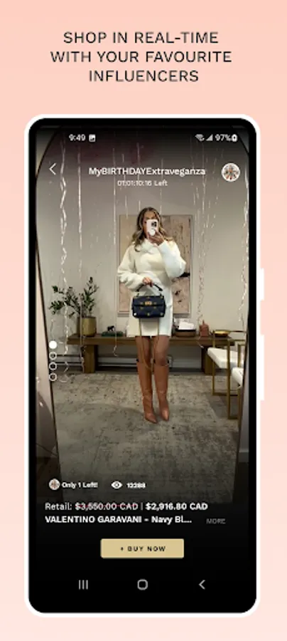 • Influencers live shop exclusive sales and stream their favorite fashion finds of the day. Simply swipe through to discover!