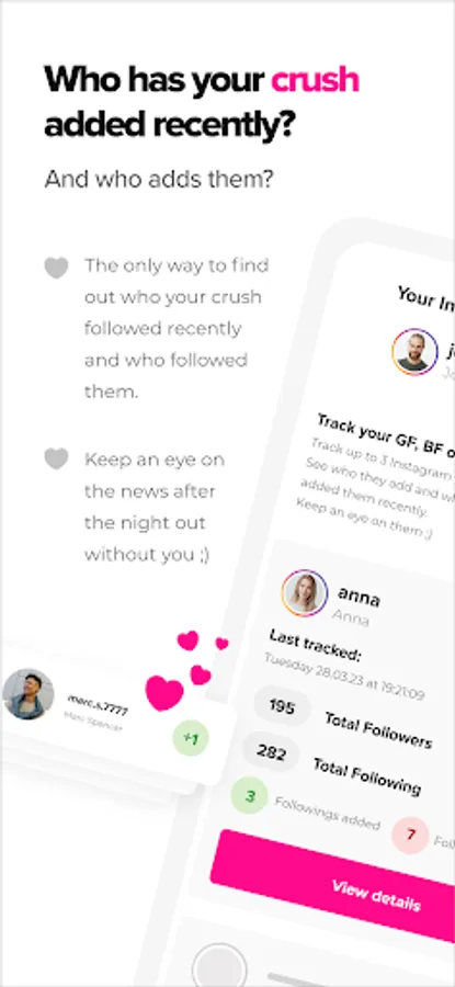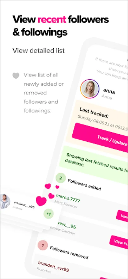 Our app tracks and keeps records of all followers and followings of the Instagram profiles you selected to track automatically.