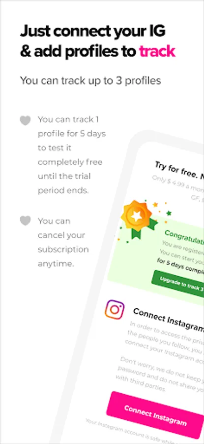 Sign up, connect your Instagram (in order to access the private profiles), and choose which profiles from your followers you want to track.
