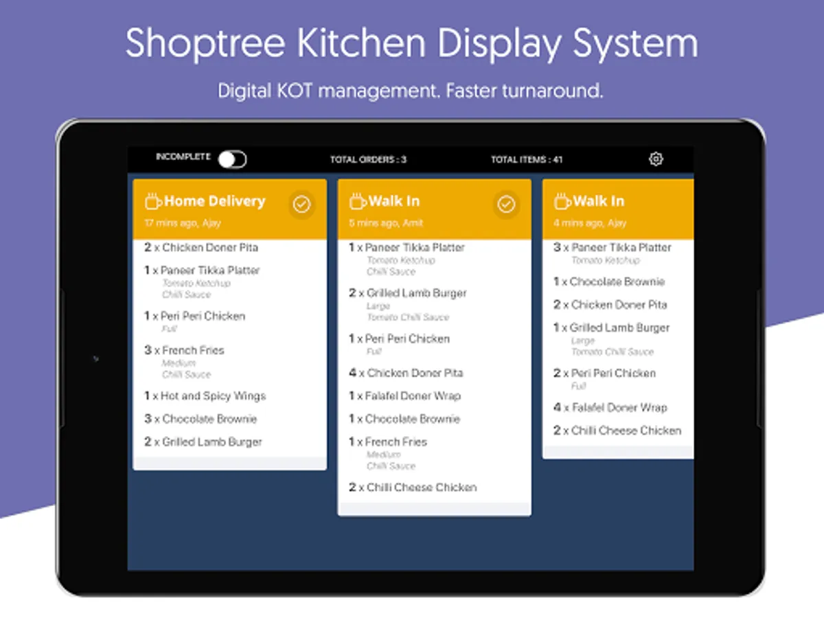 Shoptree KDS (Kitchen Display System) is a partner app of the Shoptree POS & is provided to chefs using the Shoptree platform for managing their kitchen operations better. The KDS app essentially provides a list of KOTs based on order placement time with preparation-specific information such as item name, quantity, modifiers & options, special instructions for preparation given by customer, sales channel & time elapsed for each order. It also has toggle buttons to filter orders by statuses - Incomplete & Completed.