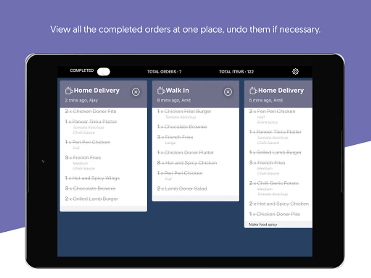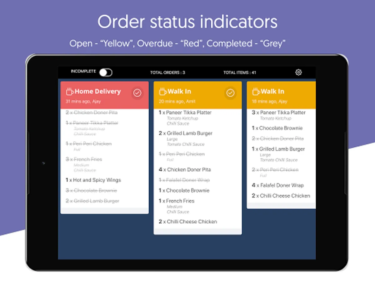 - Notification sound (every 30 seconds) to indicate there is at least one incomplete order