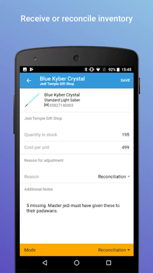 Shopventory Barcode Scanner is a tool that allows you or your employees to receive or reconcile inventory quickly without having to purchase barcode scanners or being tied to your point-of-sale.