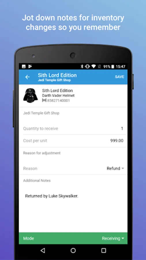 * Receive inventory from new shipments