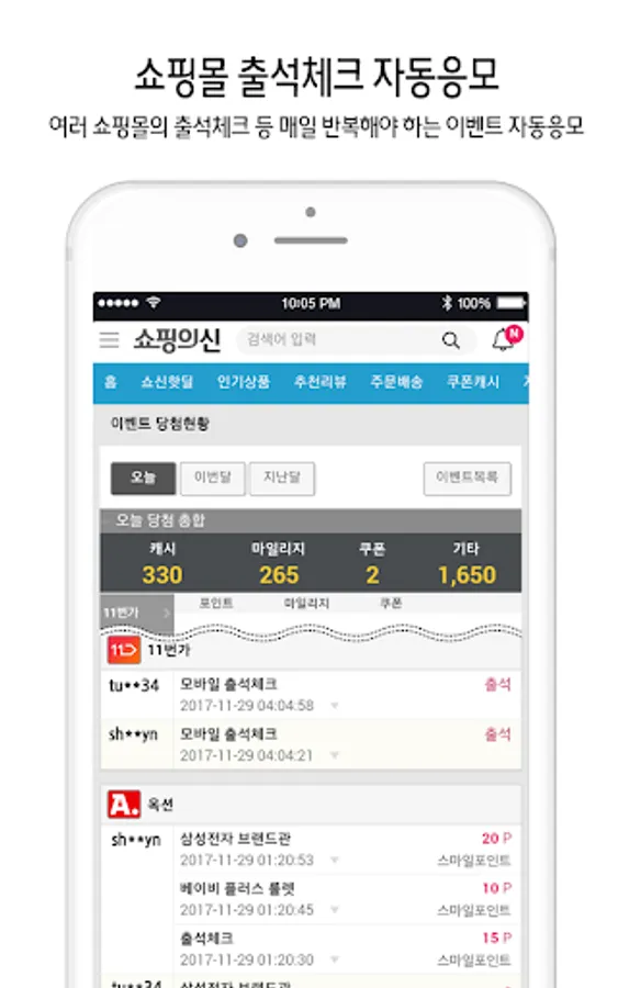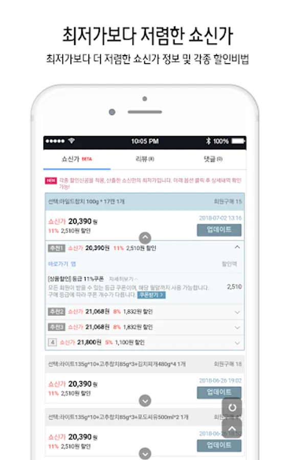 최저가 쇼핑의 새로운 기준 쇼신가와 실시간 쇼신핫딜 및 추천리뷰, 자동출첵, 주문/배송, 쿠폰/캐시 통합 관리 기능 제공!