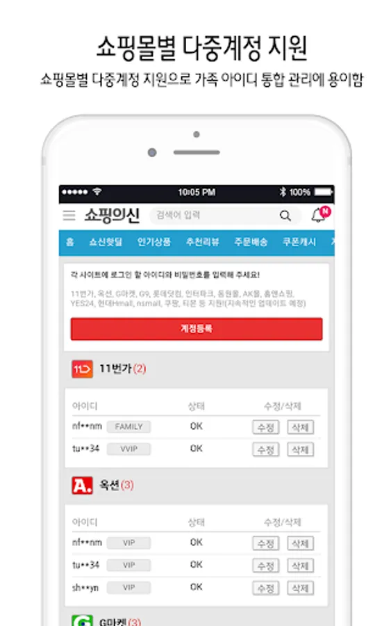 - 다중계정 지원으로 가족 아이디 주문/배송/택배 정보를 한 번에 조회할 수 있어요.