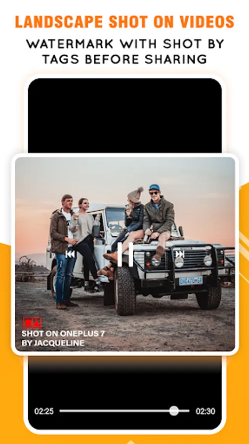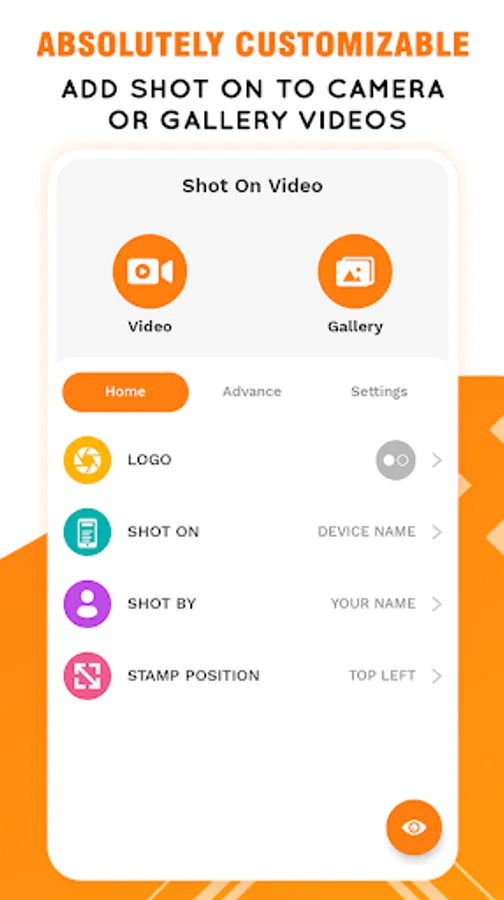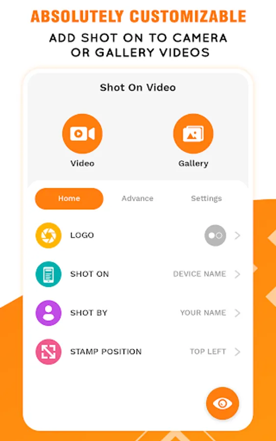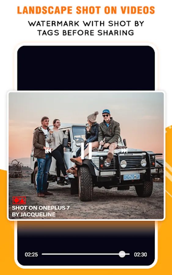 ‘Shot On Video Stamp: ShotOn Stamp Camera & Gallery’ is designed to auto add ‘Shot On’& ‘Shot By’ watermark logos : ‘Shot On (Device Name)’ and ‘Shot By (Your Name)’ on Videos in one go.
