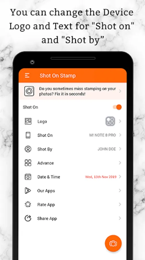 ◇ 'Shot On Stamp app for Camera Photos - Shot On Stamp Photos with ShotOn Watermark Camera' allows you to auto include "ShotOn" watermark tags on your photos caught from the inherent camera for FREE.
