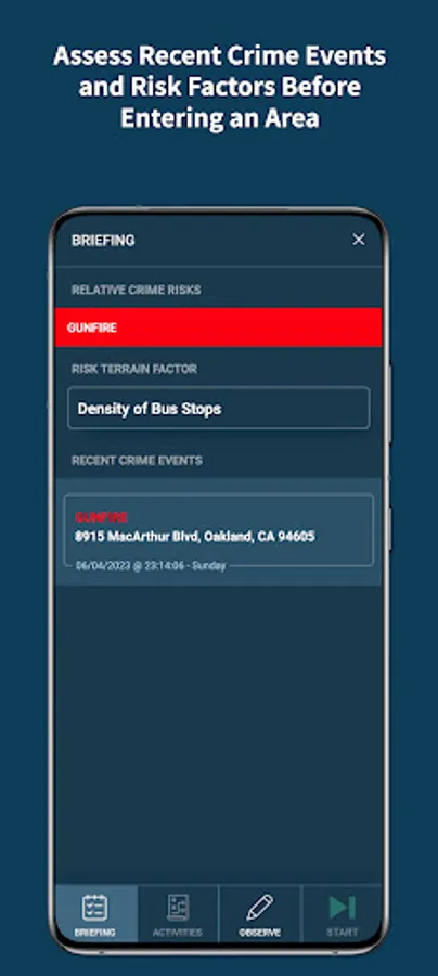 - Informs users of recent crime events and risk factors before entering a high-risk area.