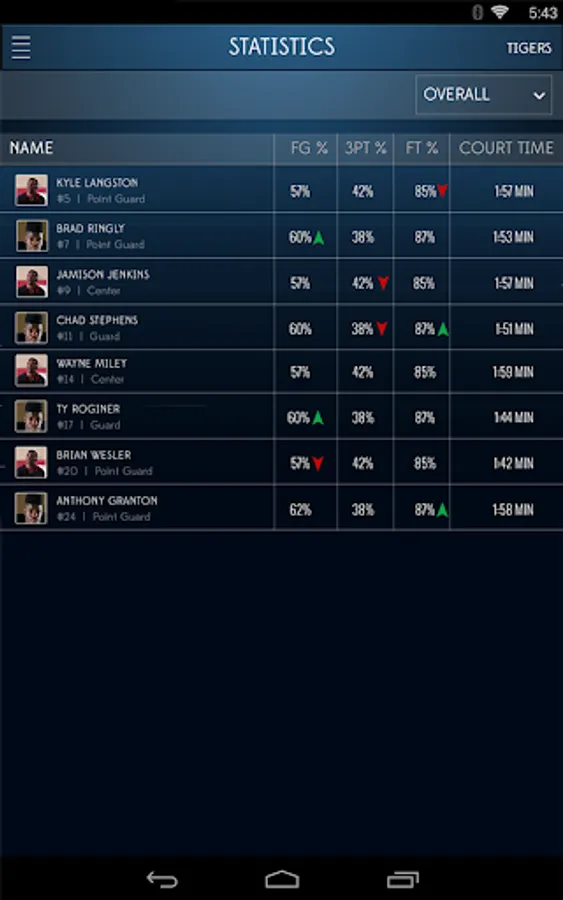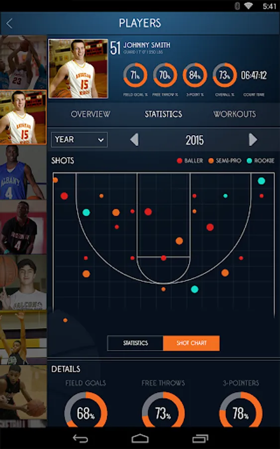 - Player details show statistics broken down by shooting percentages, time frames and specific workouts