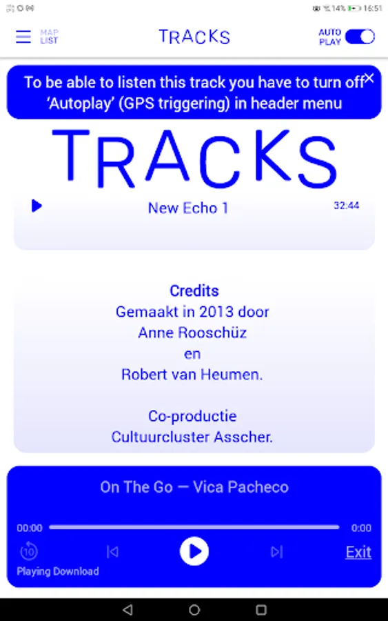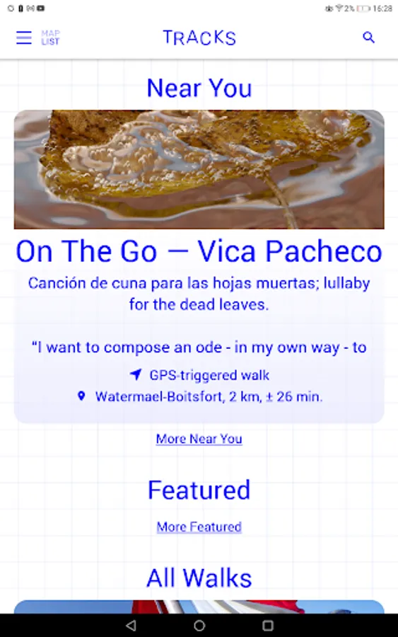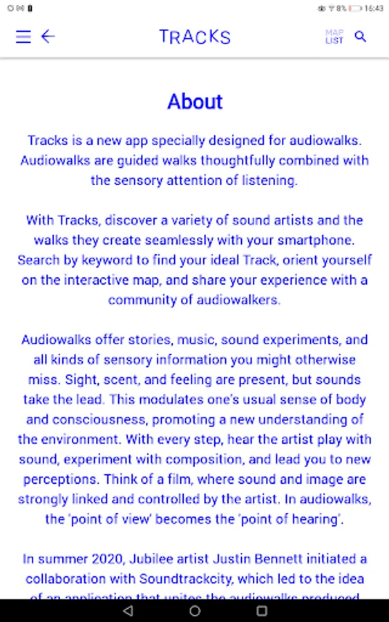 Tracks is a new app specially designed for audiowalks. Audiowalks are guided walks thoughtfully combined with the sensory attention of listening.