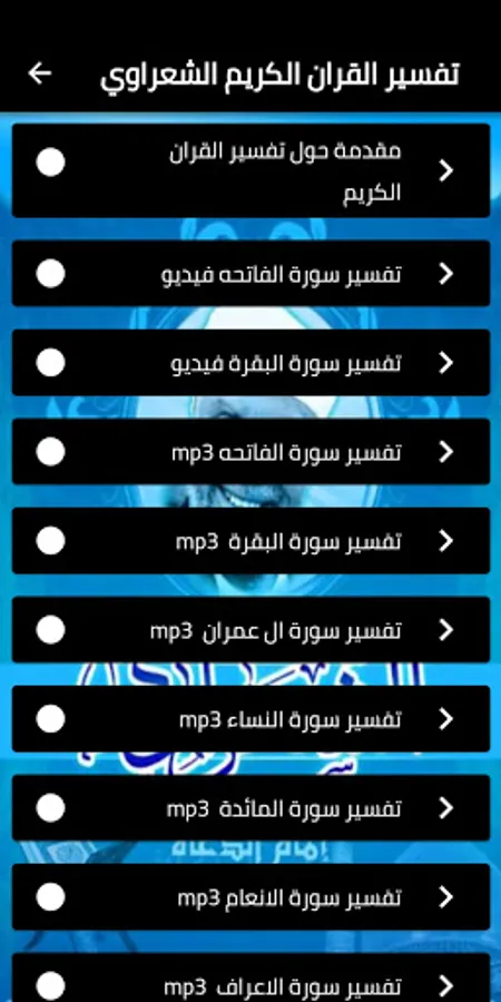 The application of the interpretation of the Holy Quran Al Shaarawi mp3 The application contains the interpretation of the surahs of the Quran from Sheikh Muhammad Metwally Al-Shaarawi mp3 and video of high quality