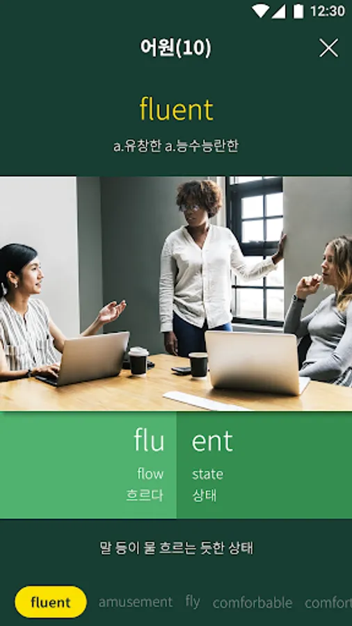 You can use a variety of memorizing materials such as 4 types of pronunciations, association images, etymology, and association words of male and female locals that are different for each word.
