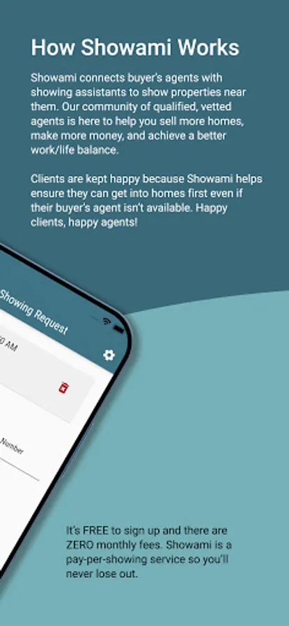 Showami is one of the best ways to handle more buyers and manage real estate showings without giving up a cent of your commission. The app connects you to qualified showing agents in your area who are available to show homes to your clients on your behalf.